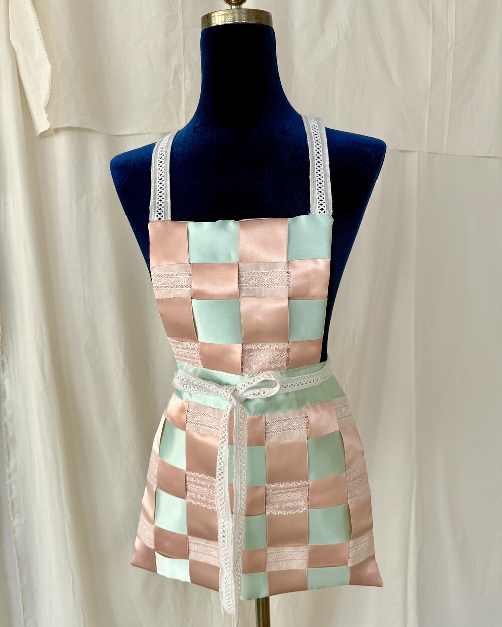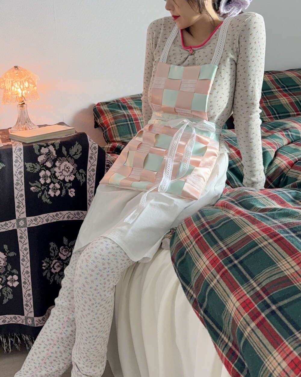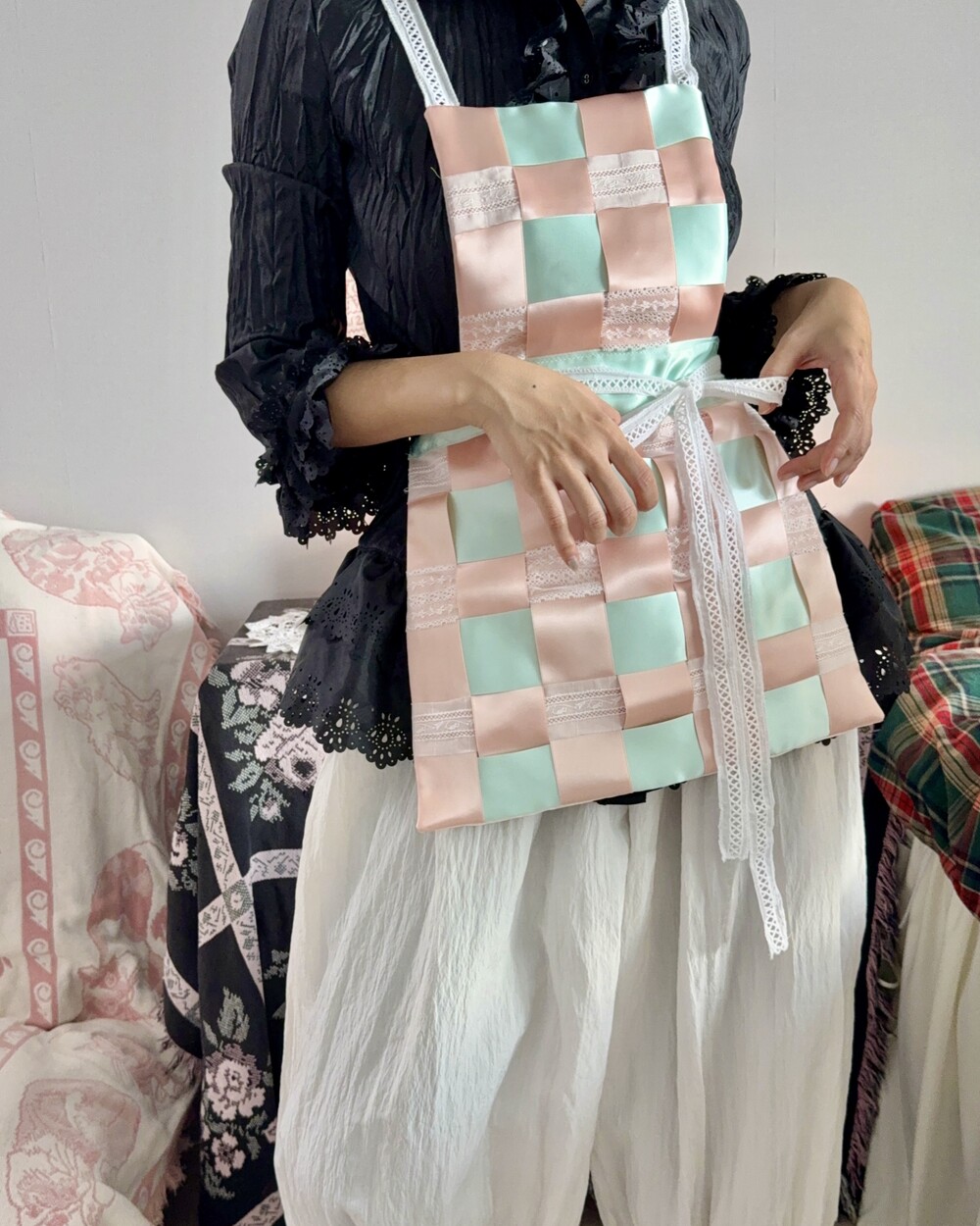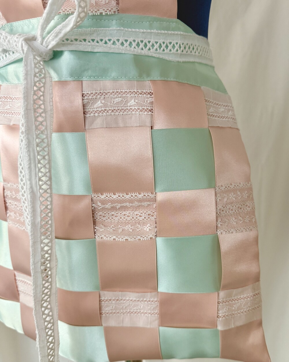 부드럽고 실키한 리본과 레이스가 격자로 교차하는 디자인으로 구조적인