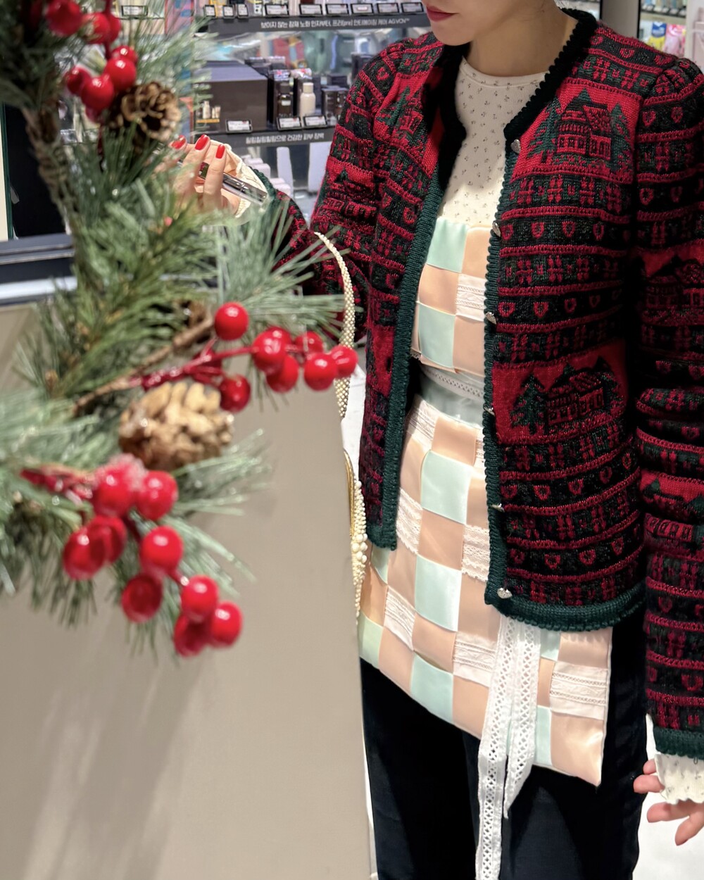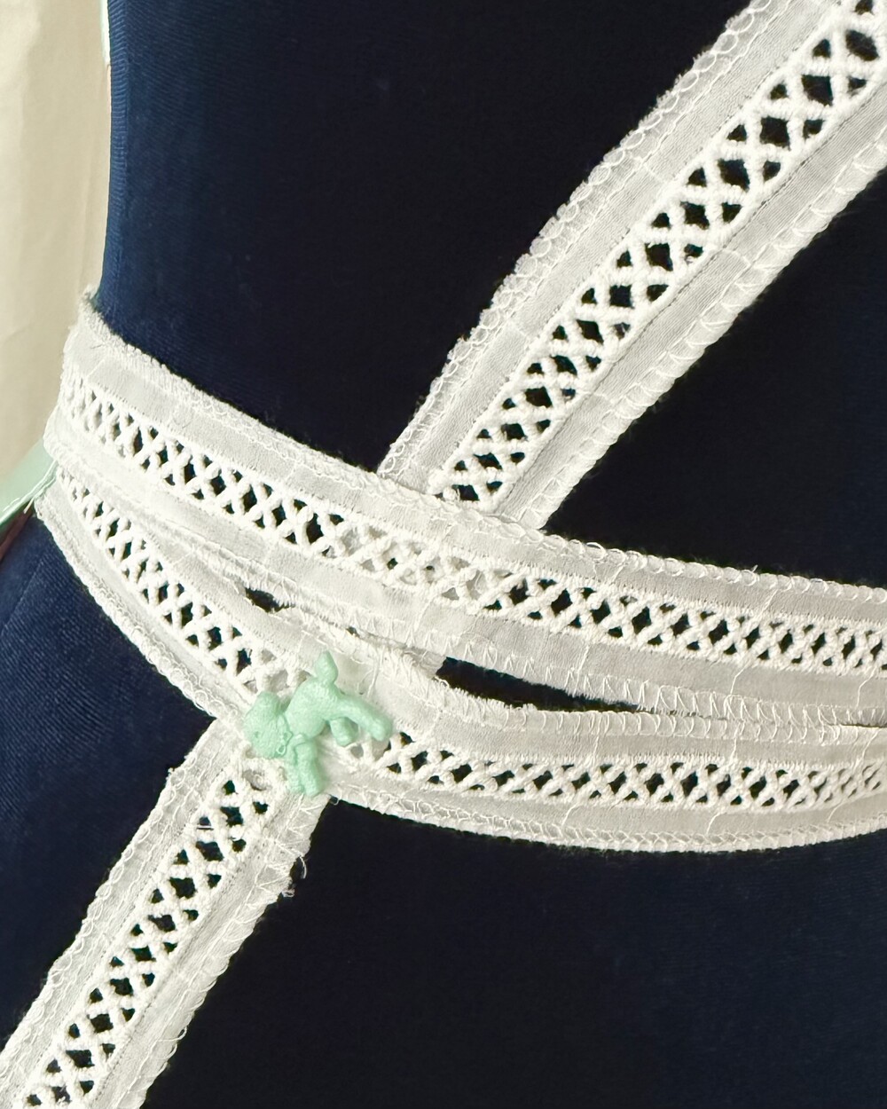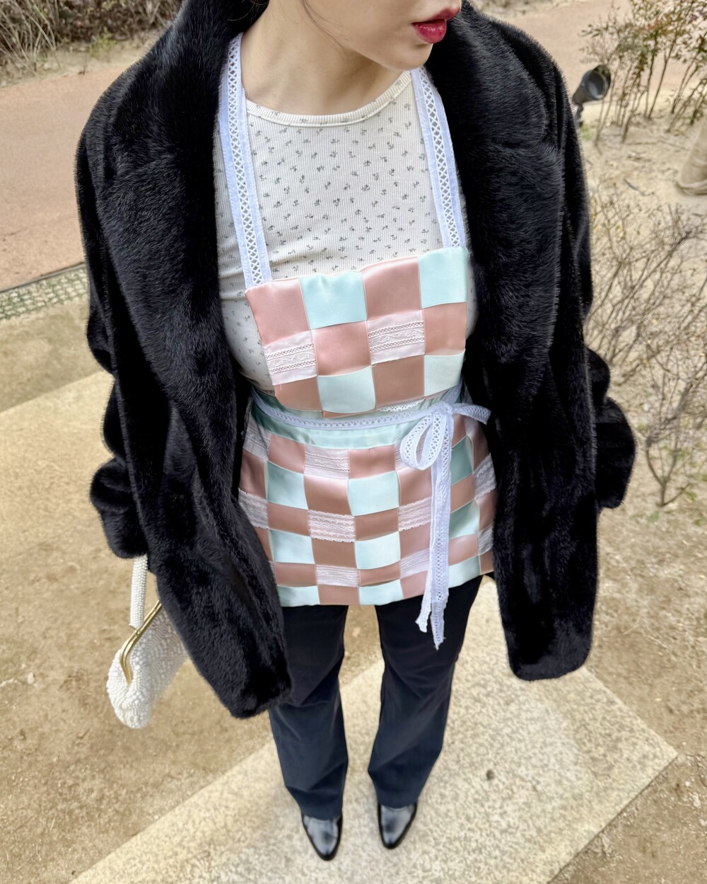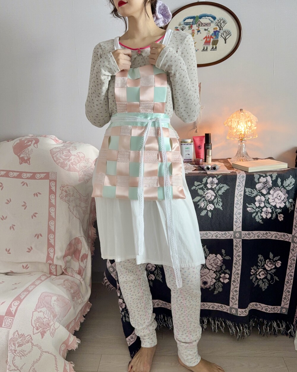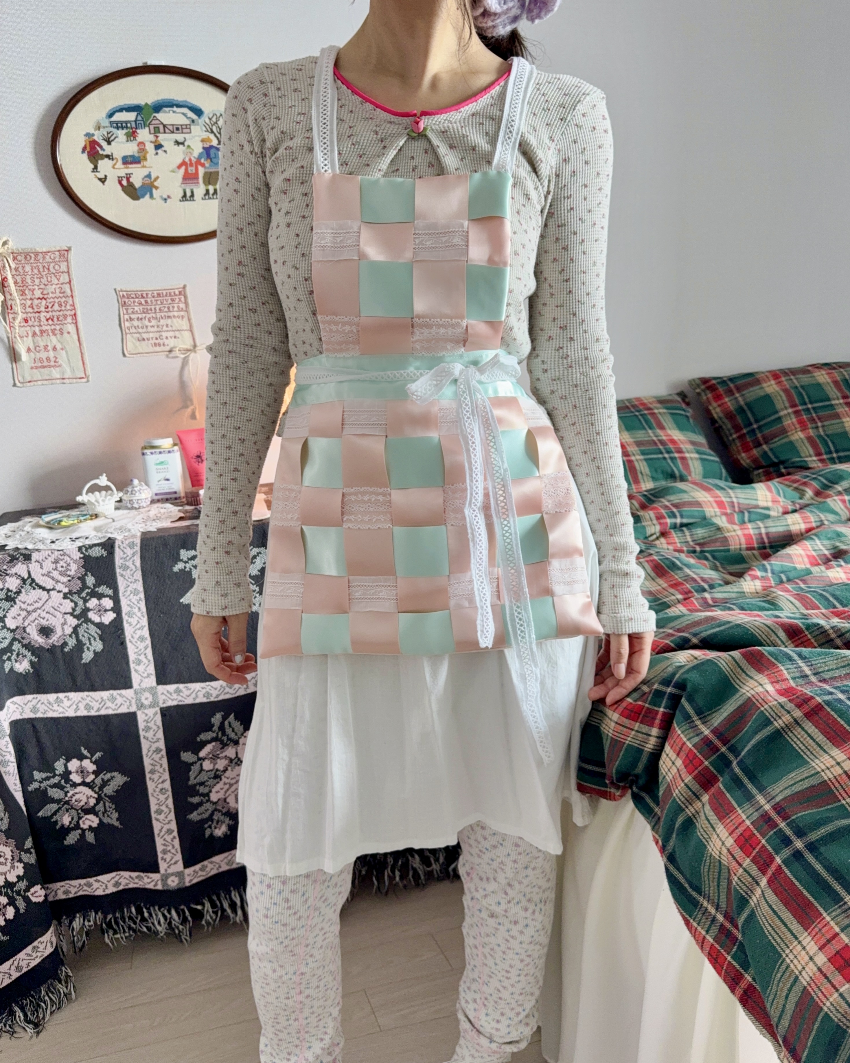 부드럽고 실키한 리본과 레이스가 격자로 교차하는 디자인으로 구조적인